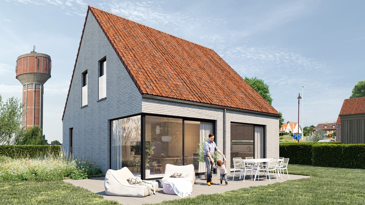 Inkomhal met ruim toilet, leefruimte met veel lichtinval en open keuken waar het zicht naar de open velden centraal staat. Aansluitend aan de keuken is er een berging voorzien met naastliggend een inpandige garage.