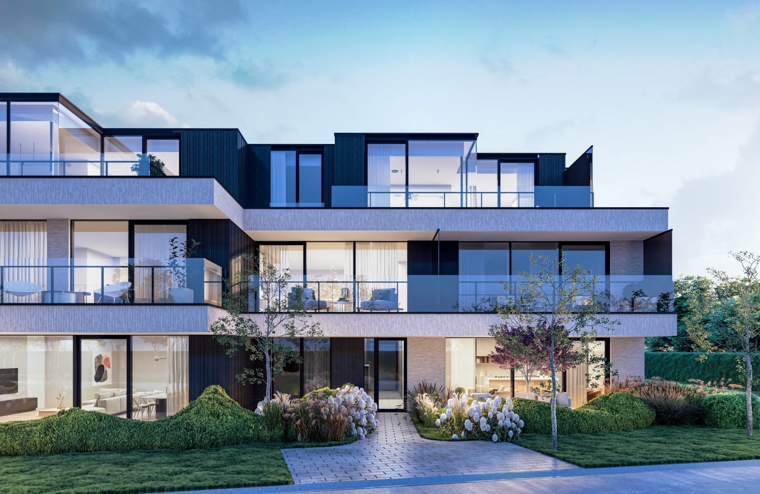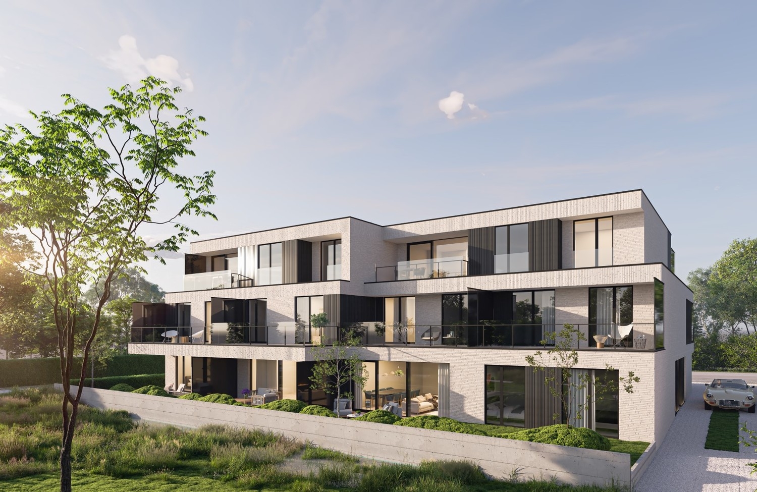 Alle appartementen beschikken over een ruim terras met zicht op de centrale groenzone of de Vaart.